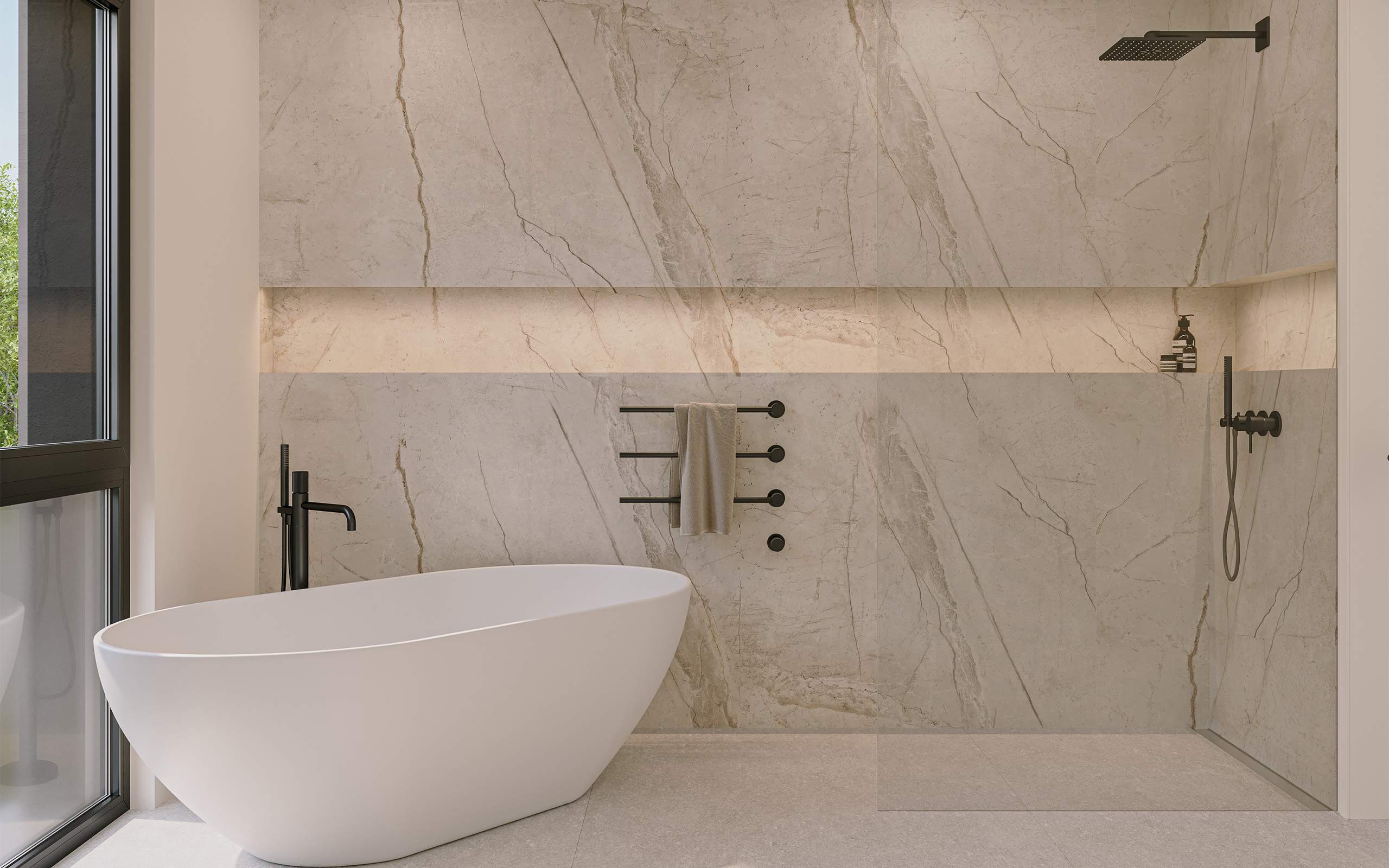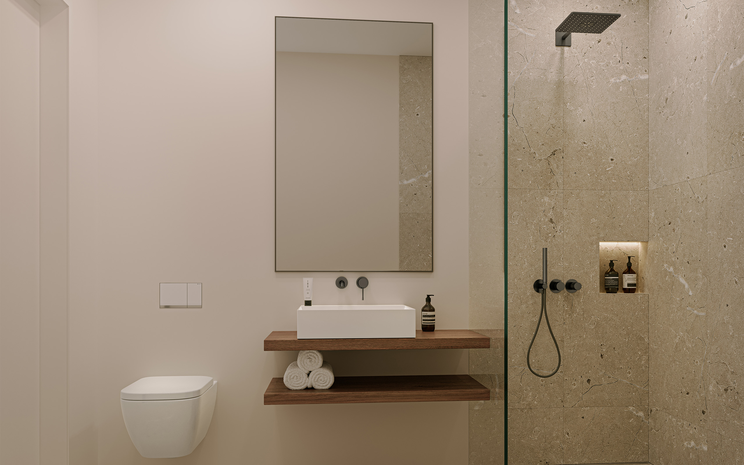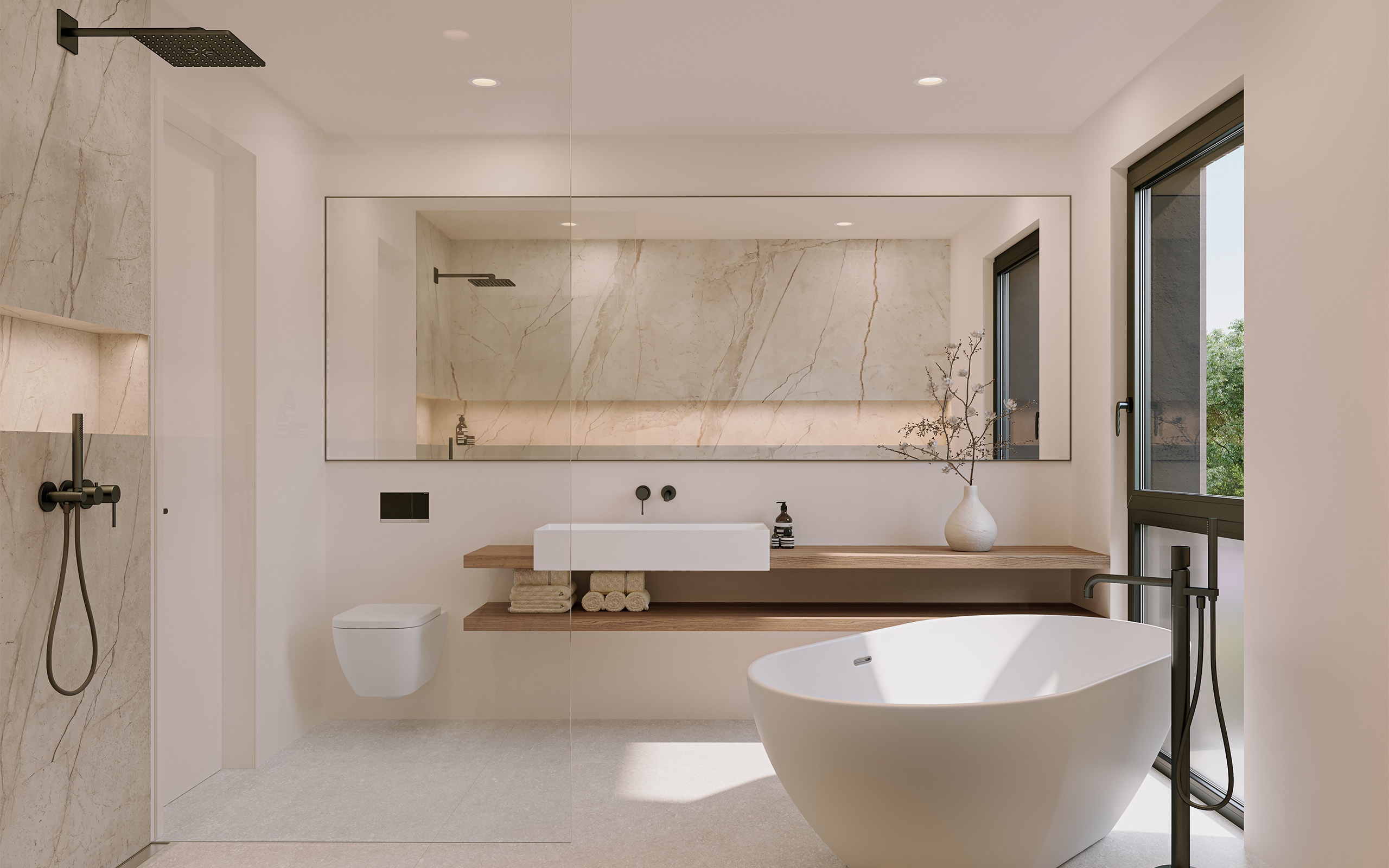 Sorgfältig ausgewählte Materialien, moderne Werkstoffe, edle Armaturen und Sanitärobjekte sowie zukunftsorientierte Technik sorgen für die perfekte Symbiose aus Natur, Design und Komfort, die zu einem neuen Lebensgefühl inspiriert.